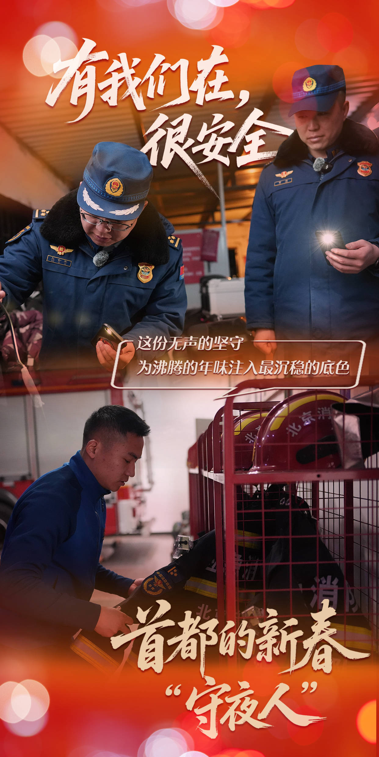 首都新春,彩灯闪烁、灯笼高挂,处处洋溢着喜庆祥和的氛围。为了守护千家万户的团圆,那一抹“火焰蓝”始终在岗,随时出征。这份无声的坚守,为沸腾年味注入沉稳的底色。