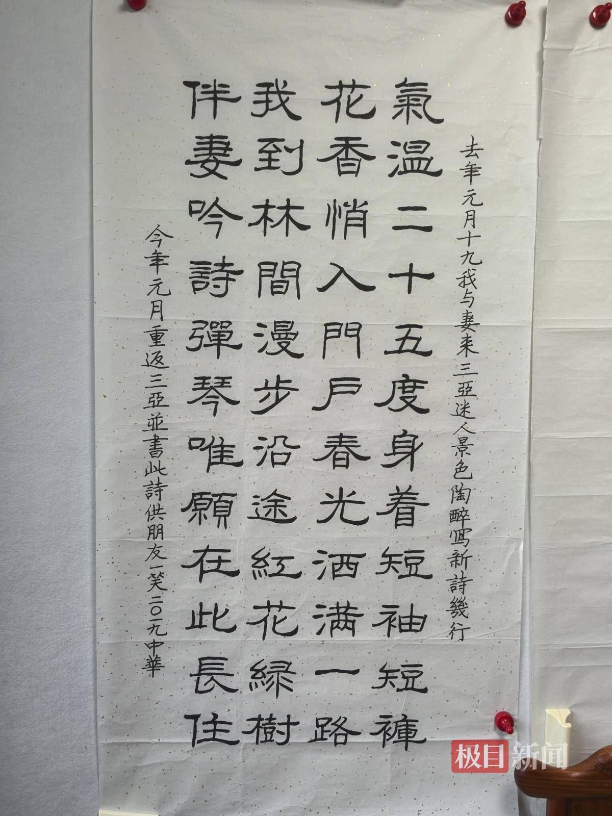 最后,庞中华先生还向极目新闻记者分享了自己在三亚用硬笔写的诗:“气温二十五度,身着短袖短裤,花香悄入门户配资炒股大全,春光洒满一路。我到林间漫步,沿途红花绿树,伴妻吟诗弹琴,唯愿在此长住。”
